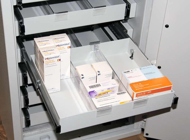 6 x Systemschubladen Medix aus Stahl auf Teleskopschienen (entnehmbar)