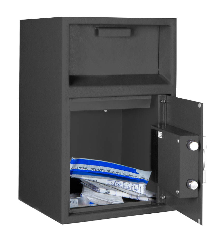 Deposit- und Einwurftresor zur Zwischenlagerung und Sicherung während des Tagesgeschäfts. Mit dem vollständigen Verschließen der Einwurfklappe fällt das Einwurfgut in das Deponierfach und ist anschließend nur noch über die Entnahmefachtür zu entnehmen – das Auffangfach ist bei geöffneter Klappe nicht einzusehen.