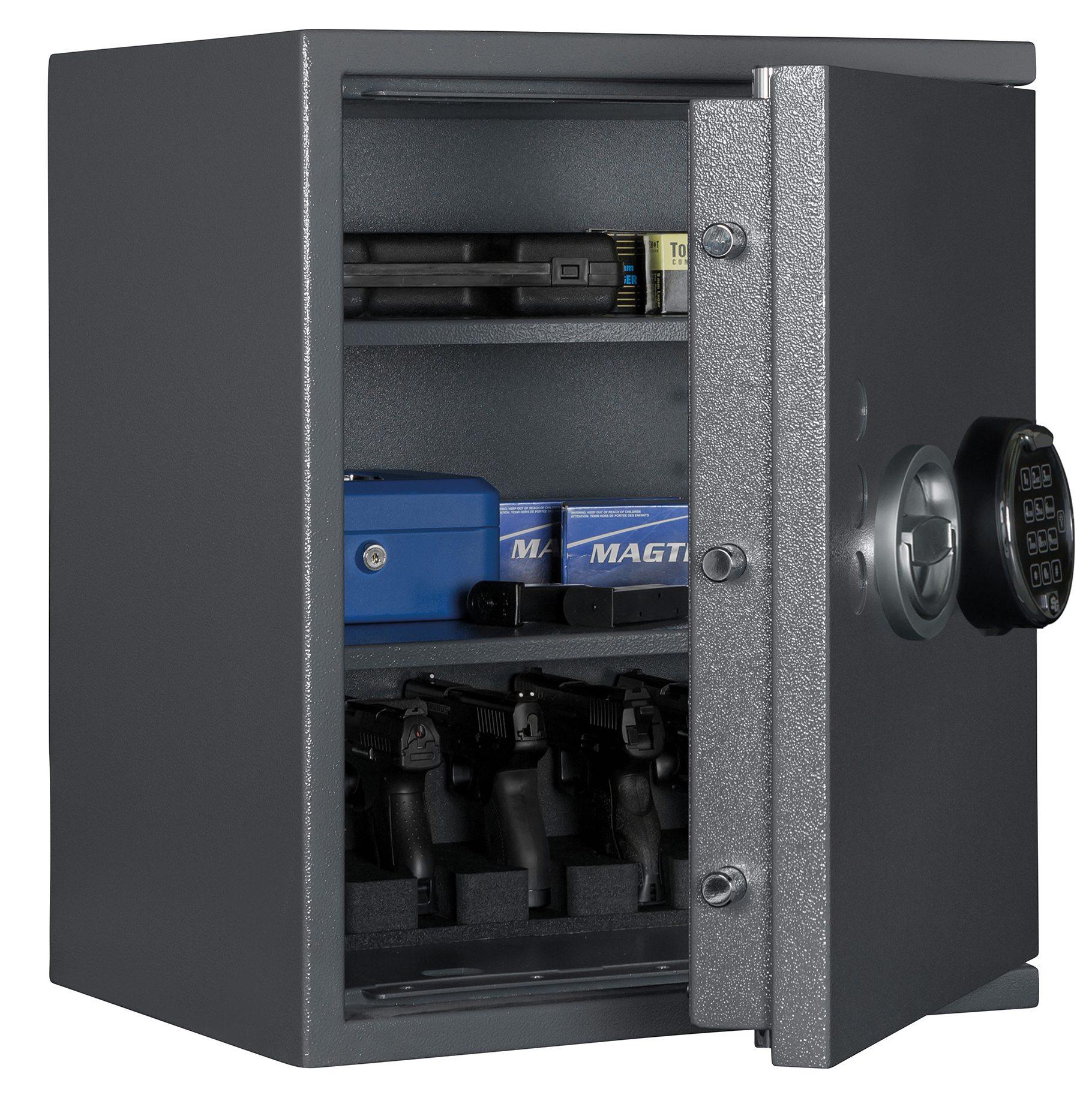 Nach §36 Waffengesetz (Aktuellster Stand 2024) dürfen Sie in diesem Kurzwaffenschrank bis zu 5 Kurzwaffen und Ihre Munition zusammen aufbewahren.