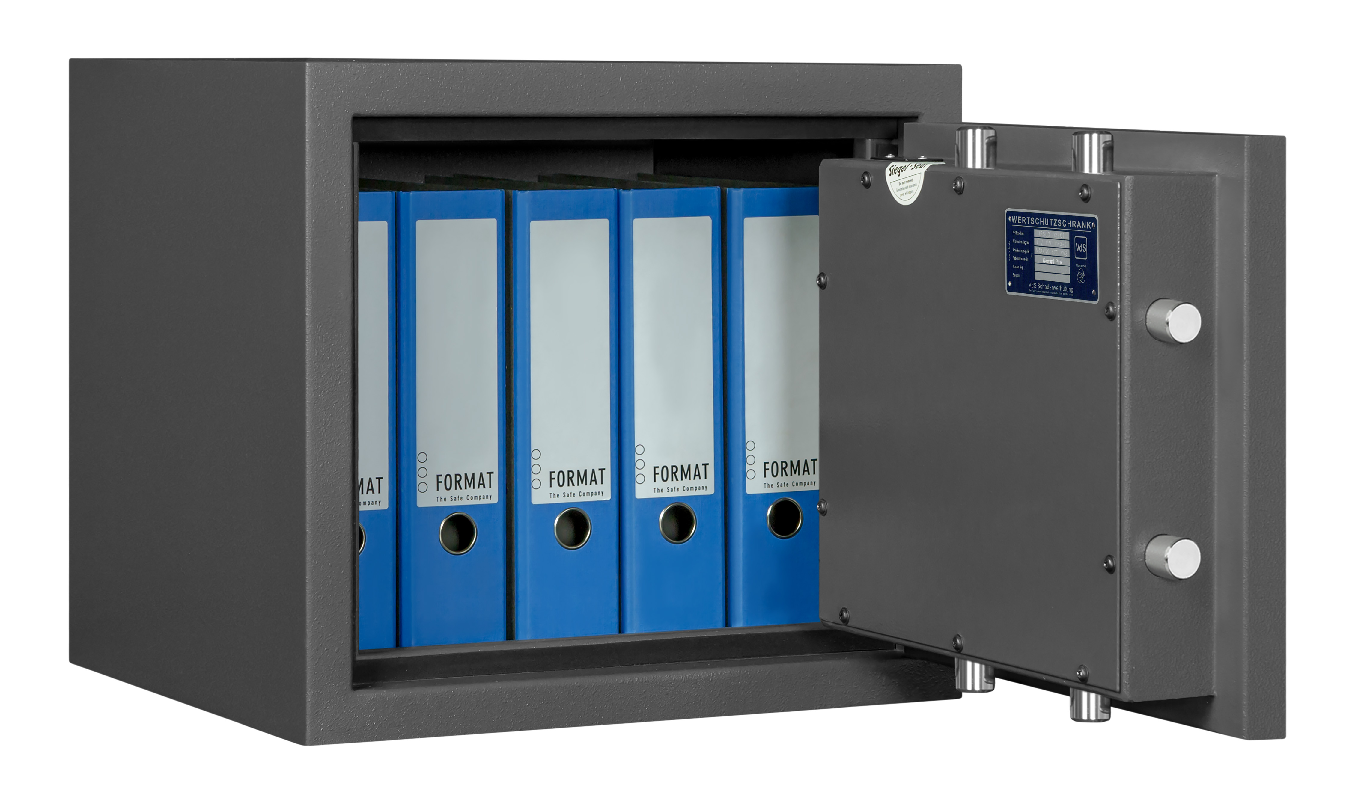 - Höchst widerstandsfähige Türfront und Korpus gegen Angriffe mit mechanischen und thermischen Einbruchwerkzeugen