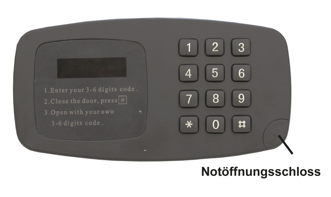 Das serienmäßige Elektronikschloss bietet eine Vielzahl von Programmiermöglichkeiten: 6-stelliges LED-Display für Status und Codeanzeige, 3-6-stelliger Gästecode, 3-6 stelliger Managercode, mit mechanischem Notöffnungsschloss (Zylinderschloss mit 2 Schlüssel), Protokollierung der letzten 100 Schließvorgänge, Verriegelung mittels Motorschloss, inkl. Batterien